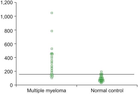 We analyzed soluble syndecan-1 levels in 28 patients with multiple myeloma and 50 normal controls, and compared its levels with Durie-Salmon stage and other markers of myeloma. In addition, we evaluated the therapeutic response and determined the 3-year survival rates of these patients.