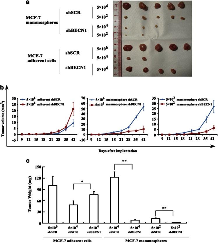 Malignant breast tissue contains a rare population of multi-potent cells with the capacity to self-renew; these cells are known as cancer stem-like cells (CSCs) or tumor-initiating cells. Primitive mammary CSCs/progenitor cells can be propagated in culture as floating spherical colonies termed 'mammospheres'. We show here that the expression of the autophagy protein Beclin 1 is higher in mammospheres established from human breast cancers or breast cancer cell lines (MCF-7 and BT474) than in the parental adherent cells. As a result, autophagic flux is more robust in mammospheres. We observed that basal and starvation-induced autophagy flux is also higher in aldehyde dehydrogenase 1-positive (ALDH1(+)) population derived from mammospheres than in the bulk population. Beclin 1 is critical for CSC maintenance and tumor development in nude mice, whereas its expression limits the development of tumors not enriched with breast CSCs/progenitor cells. We found that decreased survival in autophagy-deficient cells (MCF-7 Atg7 knockdown cells) during detachment does not contribute to an ultimate deficiency in mammosphere formation. This study demonstrates that a prosurvival autophagic pathway is critical for CSC maintenance, and that Beclin 1 plays a dual role in tumor development.