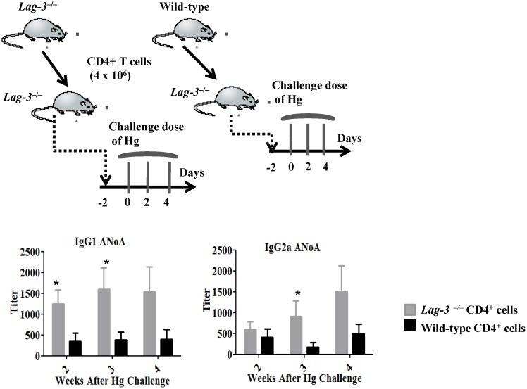Environmental factors including drugs, mineral oils and heavy metals such as lead, gold and mercury are triggers of autoimmune diseases in animal models or even in occupationally exposed humans. After exposure to subtoxic levels of mercury (Hg), genetically susceptible strains of mice develop an autoimmune disease characterized by the production of highly specific anti-nucleolar autoantibodies, hyperglobulinemia and nephritis. However, mice can be tolerized to the disease by a single low dose administration of Hg. Lymphocyte Activation Gene-3 (LAG-3) is a CD4-related, MHC-class II binding molecule expressed on activated T cells and NK cells which maintains lymphocyte homeostatic balance via various inhibitory mechanisms. In our model, administration of anti-LAG-3 monoclonal antibody broke tolerance to Hg resulting in autoantibody production and an increase in serum IgE level. In addition, LAG-3-deficient B6.SJL mice not only had increased susceptibility to Hg-induced autoimmunity but were also unresponsive to tolerance induction. Conversely, adoptive transfer of wild-type CD4(+) T cells was able to partially rescue LAG-3-deficient mice from the autoimmune disease. Further, in LAG-3-deficient mice, mercury elicited higher amounts of IL-6, IL-4 and IFN-γ, cytokines known to play a critical role in mercury-induced autoimmunity. Therefore, we conclude that LAG-3 exerts an important regulatory effect on autoimmunity elicited by a common environmental pollutant.