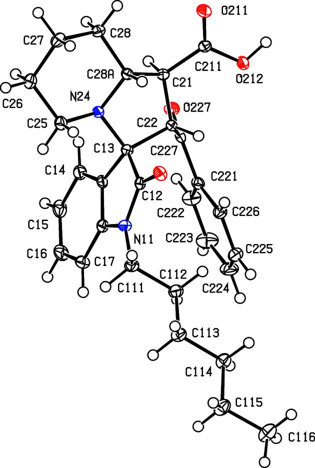 Five new spiro[indoline-3,3'-indolizine]s have been synthesized with high regio- and stereospecificity in one-pot three-component reactions between a substituted indole-2,3-dione, (S)-pipecolic acid and trans-3-benzoylacrylic acid, and subsequently characterized using a combination of elemental analysis, IR and H and C NMR spectroscopy, mass spectrometry and crystal structure analysis. (1'SR,2'SR,3RS,8a'RS)-2'-Benzoyl-5-fluoro-2-oxo-1',5',6',7',8',8a'-hexahydro-2'H-spiro[indoline-3,3'-indolizine]-1'-carboxylic acid, CHFNO, (I), and (1'SR,2'SR,3RS,8a'RS)-2'-benzoyl-5-methyl-2-oxo-1',5',6',7',8',8a'-hexahydro-2'H-spiro[indoline-3,3'-indolizine]-1'-carboxylic acid, CHNO, (II), are isomorphous, as are (1'SR,2'SR,3RS,8a'RS)-2'-benzoyl-1-methyl-2-oxo-1',5',6',7',8',8a'-hexahydro-2'H-spiro[indoline-3,3'-indolizine]-1'-carboxylic acid, CHNO, (III), and (1'SR,2'SR,3RS,8a'RS)-2'-benzoyl-5-chloro-1-methyl-2-oxo-1',5',6',7',8',8a'-hexahydro-2'H-spiro[indoline-3,3'-indolizine]-1'-carboxylic acid, CHClNO, (IV). Within each isomorphous pair, the spiro ring systems show some conformational differences. In each of (I) and (II), the molecules are linked into complex sheets by a combination of four types of hydrogen bond, and in each of (III) and (IV), a combination of O-H...O and C-H...π(arene) hydrogen bonds links the molecules to form a chain of centrosymmetric rings. In (1'SR,2'SR,3RS,8a'RS)-2'-benzoyl-1-hexyl-2-oxo-1',5',6',7',8',8a'-hexahydro-2'H-spiro[indoline-3,3'-indolizine]-1'-carboxylic acid, CHNO, (V), a combination of five hydrogen bonds links the molecules into sheets of alternating R(16) and R(46) rings. A mechanism is proposed for the formation of compounds (I)-(V) and some comparisons with related structures are made.