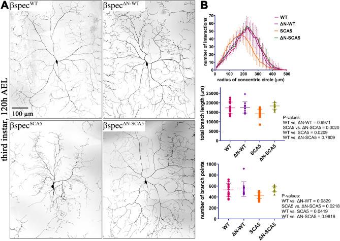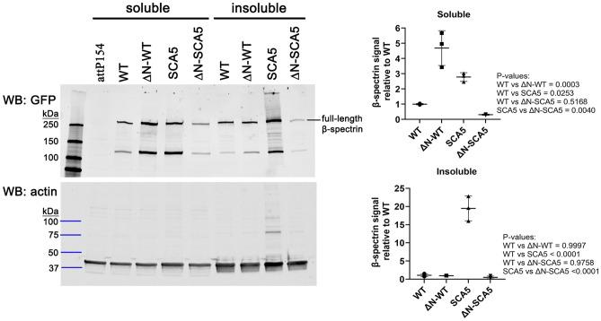 Recent structural studies of β-III-spectrin and related cytoskeletal proteins revealed N-terminal sequences that directly bind actin. These sequences are variable in structure, and immediately precede a conserved actin-binding domain composed of tandem calponin homology domains (CH1 and CH2). Here we investigated in Drosophila the significance of the β-spectrin N-terminus, and explored its functional interaction with a CH2-localized L253P mutation that underlies the neurodegenerative disease spinocerebellar ataxia type 5 (SCA5). We report that pan-neuronal expression of an N-terminally truncated β-spectrin fails to rescue lethality resulting from a β-spectrin loss-of-function allele, indicating that the N-terminus is essential to β-spectrin function in vivo. Significantly, N-terminal truncation rescues neurotoxicity and defects in dendritic arborization caused by L253P. In vitro studies show that N-terminal truncation eliminates L253P-induced high-affinity actin binding, providing a mechanistic basis for rescue. These data suggest that N-terminal sequences may be useful therapeutic targets for small molecule modulation of the aberrant actin binding associated with SCA5 β-spectrin and spectrin-related disease proteins.