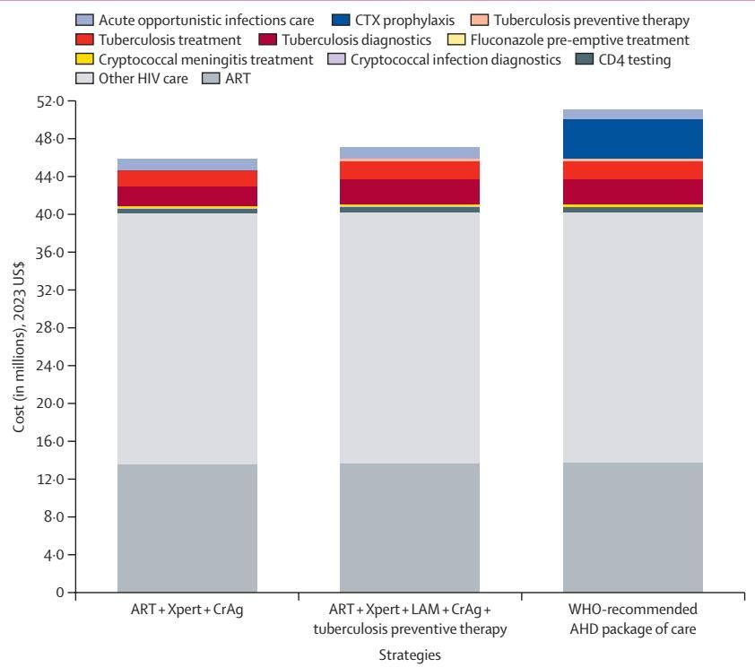 图[2]:未来5年的预算影响分析。灰色部分代表常规的ART药物和护理成本,它占据了绝对大头。顶部的彩色细条才是WHO推荐的晚期护理包带来的额外成本(包括结核病、隐球菌的检测与预防等)。