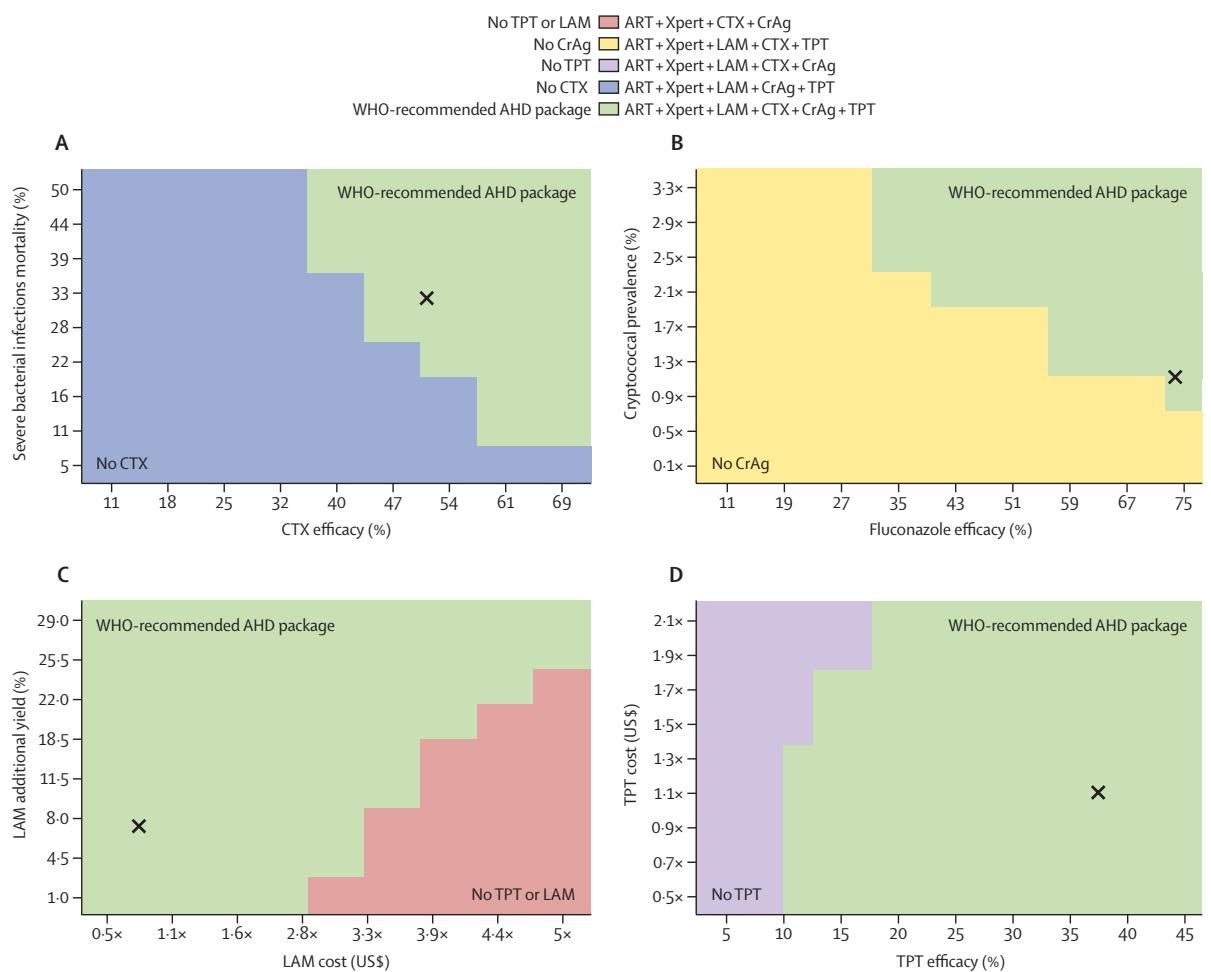 图[1]:不同情境下的最优策略选择分析。横轴代表人群中晚期艾滋病(AHD)患者的比例,纵轴代表我们愿意为每多活一年支付的费用(成本效益阈值)。图中的大片绿色区域代表WHO推荐的全套方案是“最优解”。