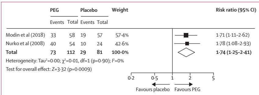 首先,我们要确认的是药物是否真的比“糖丸”有效。如图[1]所示,当我们审视聚乙二醇(PEG)与安慰剂对比的森林图时,可以清晰地看到代表风险比(Risk Ratio, RR)的黑色方块显著地分布在垂直线的右侧,即“倾向于 PEG”的一侧。