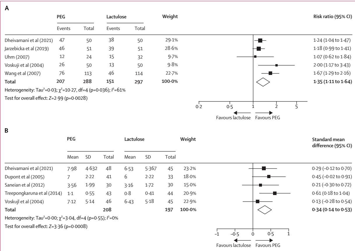 在临床实践中,乳果糖(Lactulose)常作为 PEG 的替代品。那么,二者孰优孰劣?研究者纳入了 5 项研究进行了直接比较。如图[2]的 A 部分所示,在治疗成功率方面,PEG 再次展现了其统治力,其效果可能是乳果糖的 1.35 倍(RR 1.35, 95% CI 1.11–1.64)[2]。