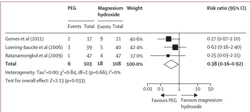 在这方面,研究团队对比了 PEG 与另一种常用药物——氢氧化镁(Magnesium hydroxide)。如图[3]所示,这张森林图统计的是因不良事件导致的研究退出率(Withdrawals due to adverse events)。在这里,数据点位于左侧(Favours PEG)意味着 PEG 组的退出率更低。