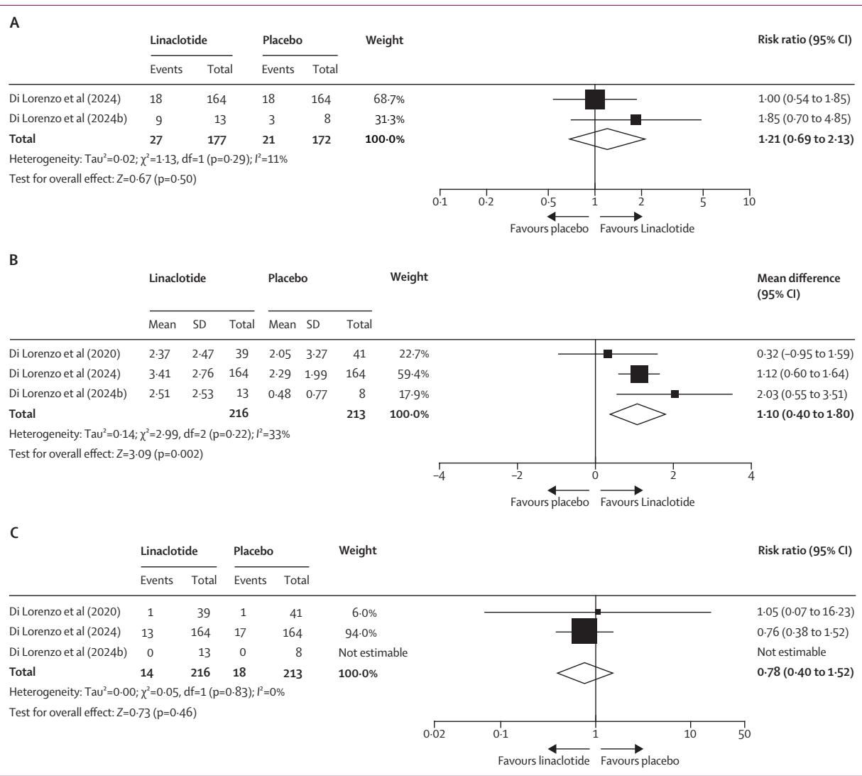 如图[4]所示,我们需要从两个维度来审视这种药物的表现。首先看图[4]的 A 部分,这是关于“治疗成功率”的统计。菱形图标横跨了无效线(RR 1.21, 95% CI 0.69–2.13),这意味着在统计学上,我们无法断定利那洛肽在实现整体“治疗成功”方面显著优于安慰剂。这听起来令人沮丧,对吧?