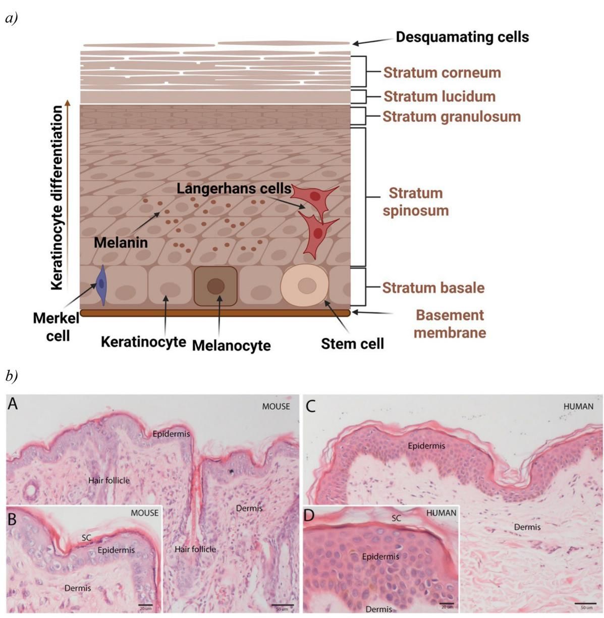 如图[1]所示,当我们把人类皮肤与小鼠皮肤放在显微镜下对比时,差异一目了然。在这张图中,我们可以清晰地看到,人类皮肤(右侧)拥有厚实的表皮层(Epidermis),这是主要的屏障所在;而小鼠皮肤(左侧)的表皮层则非常薄。更有趣的是,小鼠皮肤上布满了密集的毛囊(Hair follicle),这是它们的主要特征之一,而人类皮肤的毛囊密度则低得多。此外,两者的真皮层(Dermis)与下层肌肉的连接方式也不同,小鼠皮肤连接疏松,这使得它们的皮肤吸收特性与人类大相径庭。正是这些微观结构上的根本差异,导致了许多在小鼠身上有效的药物,到了人身上却毫无作用,甚至产生毒性。
