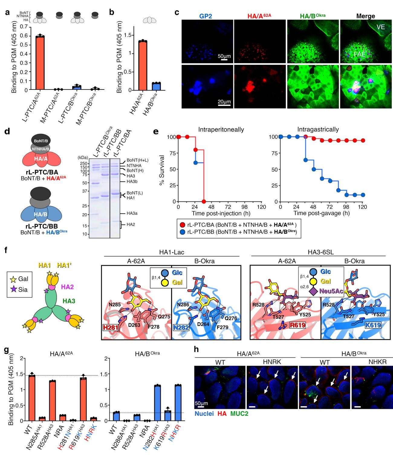 为了从分子层面彻底看清这个过程,研究团队利用X射线晶体学技术解析了毒素蛋白的结构。如图[4]中的f所示,这是毒素上的“抓手”——血凝素(HA)蛋白的精细结构。