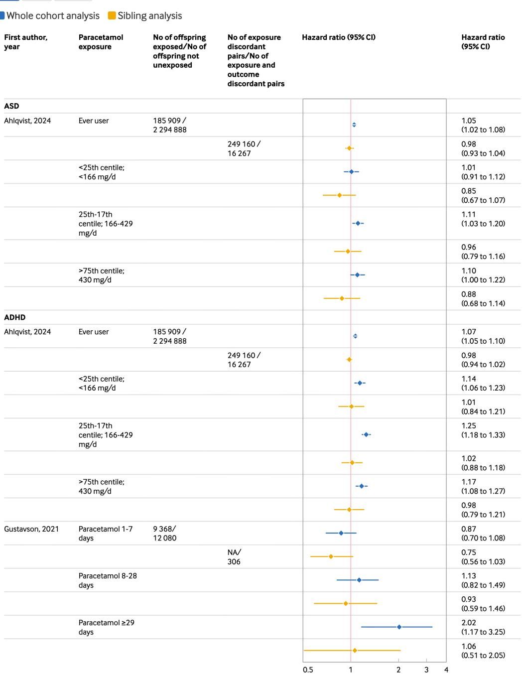 在同胞对照分析(黄色)中:情况发生了根本性逆转。当我们将目光移向黄点,会发现它们迅速向左回撤,回归到了参考线附近。对于同样的Ahlqvist研究,在同胞分析中,ADHD的风险比降至0.98(95% CI 0.94-1.02),完全排除了风险增加的可能性。自闭症(ASD)的数据表现出同样的趋势(从1.05降至0.98)。