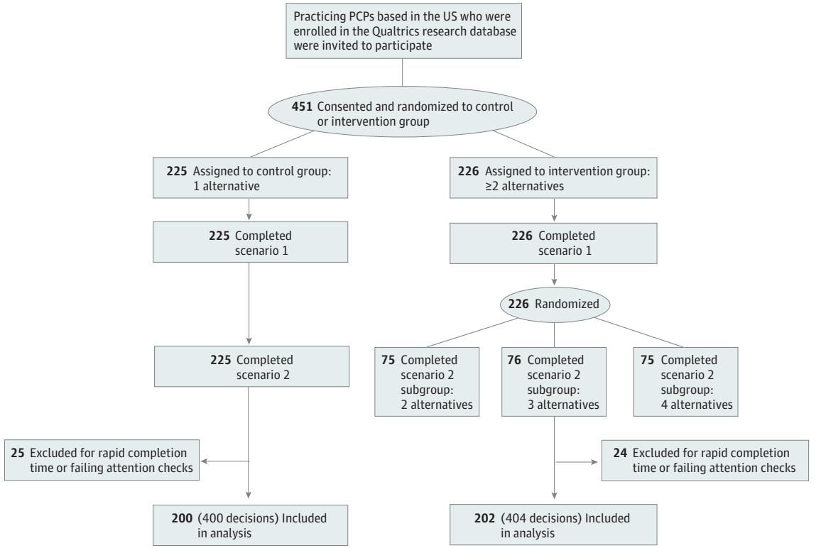 为了厘清这一争议,研究团队设计了一项严谨的随机临床试验,旨在探究替代方案的数量(1个 vs 多于1个)究竟如何影响医生的最终决策。
