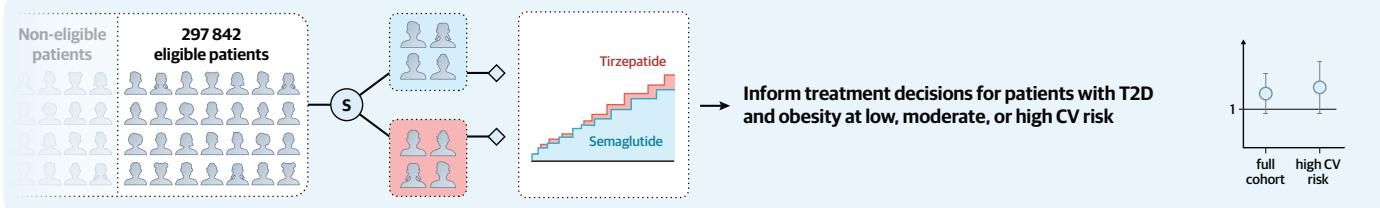 研究团队首先通过模拟著名的SUSTAIN-6和SURPASS-CVOT试验,验证了其分析框架的准确性,随后在扩展的真实世界人群中进行了直接的“头对头”比较。如图[2]所示,研究设计精妙地模拟了随机对照试验的流程:从庞大的非入组人群中筛选出符合资格的297,842名患者,利用倾向性评分匹配(Propensity Score Matching)技术,构建了两个在基线特征上高度平衡的队列,分别接受替尔泊肽和司美格鲁肽治疗,旨在为低、中、高心血管风险的2型糖尿病及肥胖患者提供治疗决策依据。