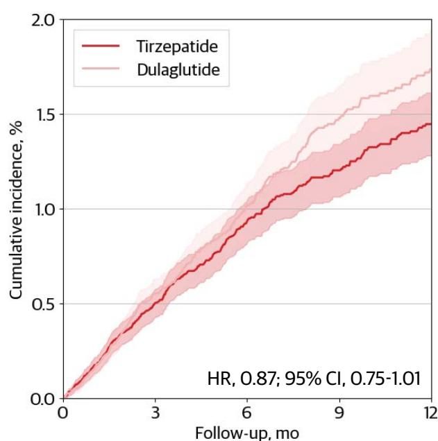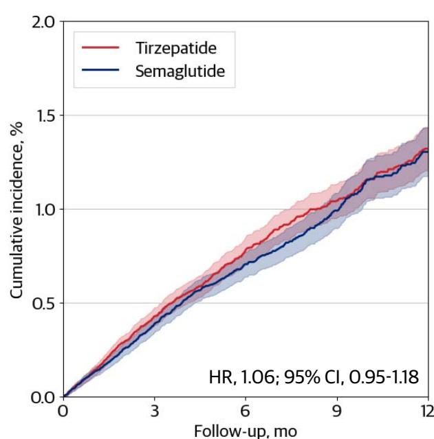 在平均随访期间,替尔泊肽组与司美格鲁肽组在主要复合终点(MACE)上的发生率惊人地相似。如图[3]所示,代表替尔泊肽(红色曲线)和司美格鲁肽(蓝色曲线)的累积发病率线条在随访的一年多时间里几乎纠缠在一起,难分伯仲。具体数据显示,两组的风险比(Hazard Ratio, HR)为1.06(95% CI, 0.95-1.18)。从图中我们可以清晰地解读出关键信息:两条曲线周围的阴影区域(代表置信区间)大面积重叠,且HR值的置信区间跨越了1(即无差异线),这意味着在统计学上,替尔泊肽并没有表现出优于、甚至在数值上还略微(尽管不显著)逊色于司美格鲁肽的心血管保护效应。