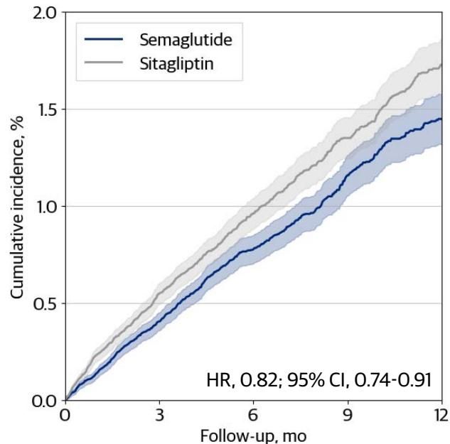 他们利用同样的数据库和统计方法,先模拟了已经完成的临床试验。例如,他们模拟了SUSTAIN-6试验(司美格鲁肽 vs. 安慰剂/西格列汀)。结果显示,在扩展人群中,司美格鲁肽相较于西格列汀(作为安慰剂代理)显著降低了心血管风险(HR 0.82)。如图[4]所示,司美格鲁肽组(蓝色线)的累积发病率明显低于西格列汀组(灰色线),且两条曲线在随访早期就已分道扬镳,这与已发表的随机对照试验结果高度一致,从而有力地证实了该研究分析方法的可靠性。