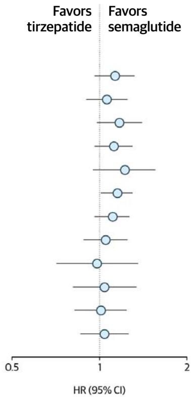 如图[6]的森林图所示,在针对替尔泊肽与司美格鲁肽的详细亚组分析中,无论是按年龄、性别,还是是否合并使用SGLT2抑制剂,HR值的点估计大多落在1附近。然而,值得注意的是,在某些特定高风险亚组中,点估计值略微偏向司美格鲁肽(即HR > 1),虽然都未达统计显著,但这提示我们:对于已经建立的高危心血管疾病患者,司美格鲁肽目前积累的证据或许更为“硬核”。