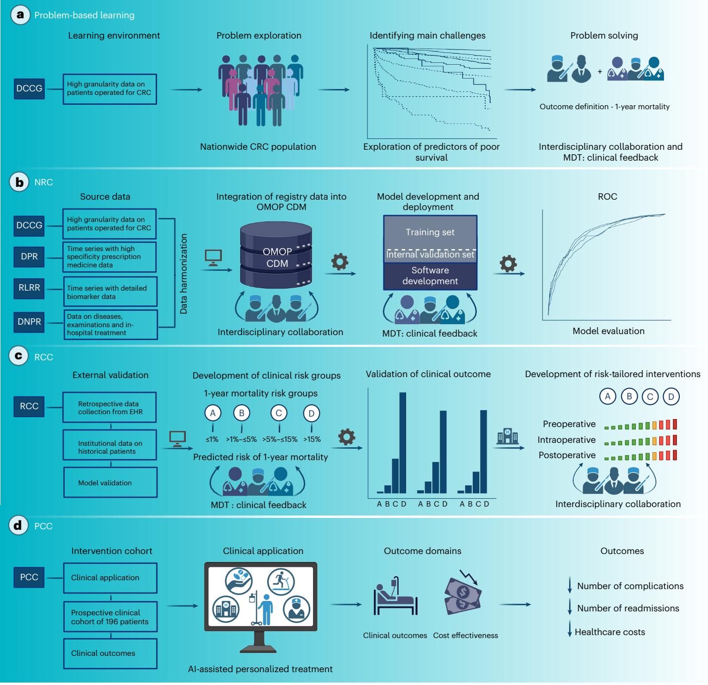 近期,发表在顶刊《Nature Medicine》上的一项研究给出了令人振奋的答案。来自丹麦西兰大学医院(Zealand University Hospital)的研究团队,利用丹麦国家登记处的18,403名结直肠癌患者数据,开发并验证了一款基于人工智能的风险预测模型。更重要的是,他们并未止步于“纸上谈兵”,而是将该模型真正植入到了临床工作流中,作为决策支持工具实现了个性化的围手术期治疗。