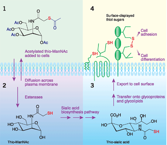 唾液酸(红色)在细胞表面形成"糖衣"保护层,癌细胞劫持这一机制逃避免疫监视(图片来源:Nature Chemical Biology)