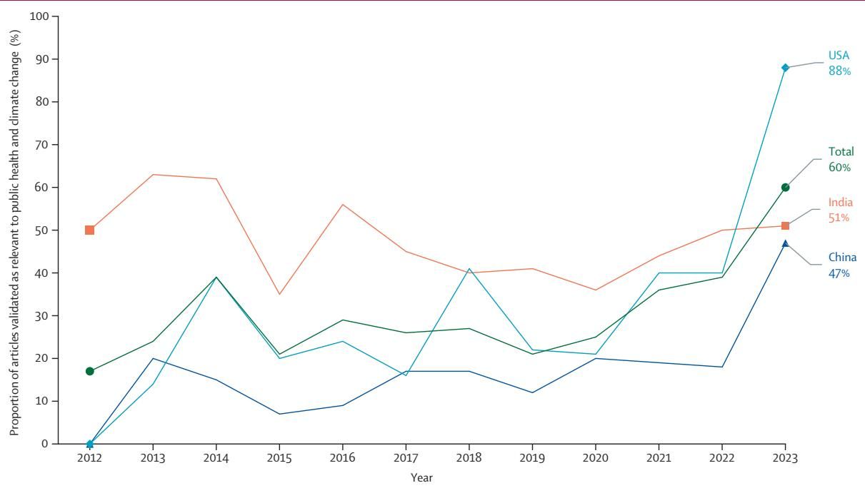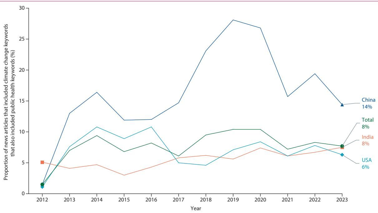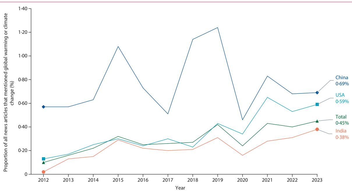 为了解开这个谜题,发表在顶级期刊《柳叶刀-星球健康》(The Lancet Planetary Health)上的一项最新研究,对全球最大的三个碳排放国——中国、印度和美国——在过去十年间(2012-2023年)的新闻报道进行了前所未有的深入剖析。研究团队分析了这三个国家主流报纸上的超过2200万篇文章,试图回答一个核心问题:在气候危机的宏大叙事中,公众健康的议题究竟占据了多大的版面?