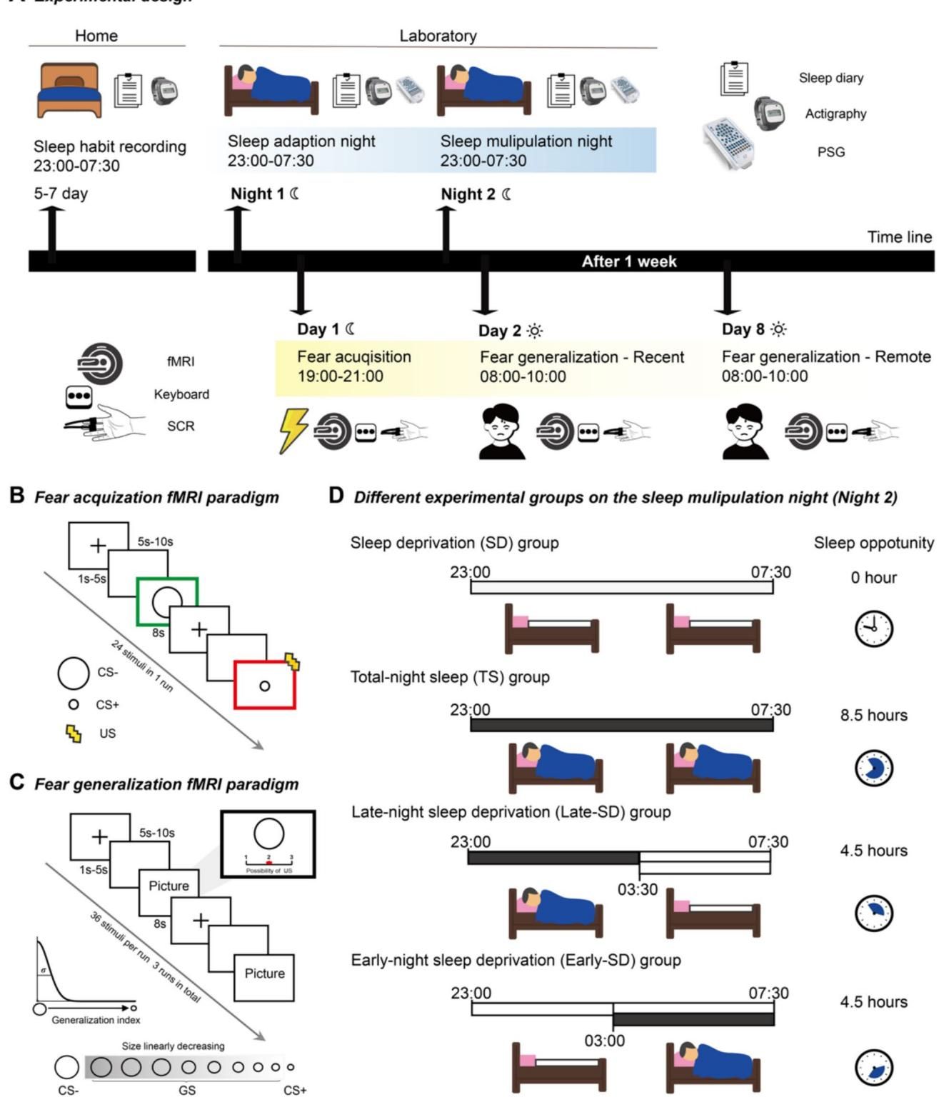 从图[1]的实验流程中我们可以清晰地看到,所有受试者首先在第一天晚上经历了恐惧习得(Fear Acquisition)阶段。在这个阶段,他们学会将某种特定的视觉刺激(CS+,例如大圆圈)与轻微的电击关联起来,而另一种刺激(CS-,例如小圆圈)则代表安全。随后,在经历了不同方式的睡眠操控后,受试者在第二天早上进行了近期恐惧泛化测试,并在一周后进行了远期恐惧泛化测试。在测试中,除原本的CS+和CS-外,还加入了一系列大小介于两者之间的新圆圈(GS,泛化刺激),以此来精准量化受试者的恐惧是否“波及无辜”。