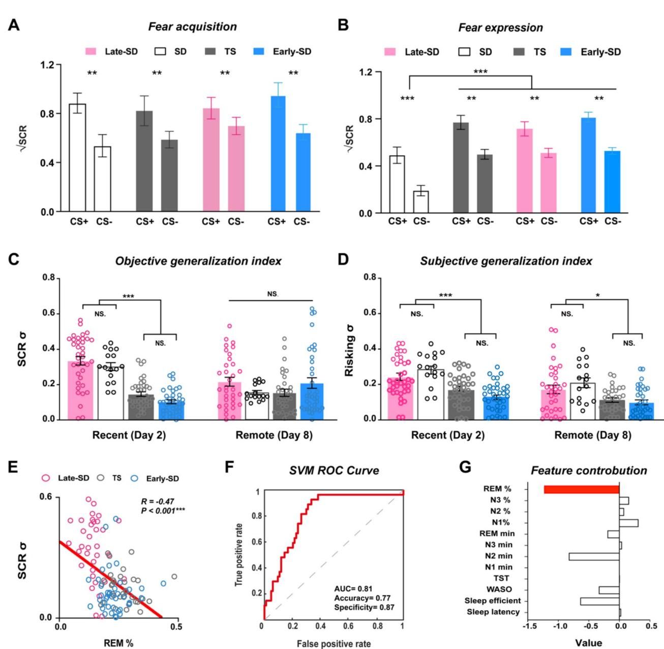 更有趣的是,这种保护作用并非稍纵即逝。虽然一周后的测试显示生理上的恐惧泛化差异有所减弱,但主观上的恐惧泛化在REM缺失组中依然存在。进一步的数据分析还发现,REM睡眠的占比越高,受试者第二天的恐惧泛化程度就越低。机器学习模型甚至能够仅凭REM睡眠的比例,就以极高的准确率预测一个人是否会出现恐惧过度泛化。
