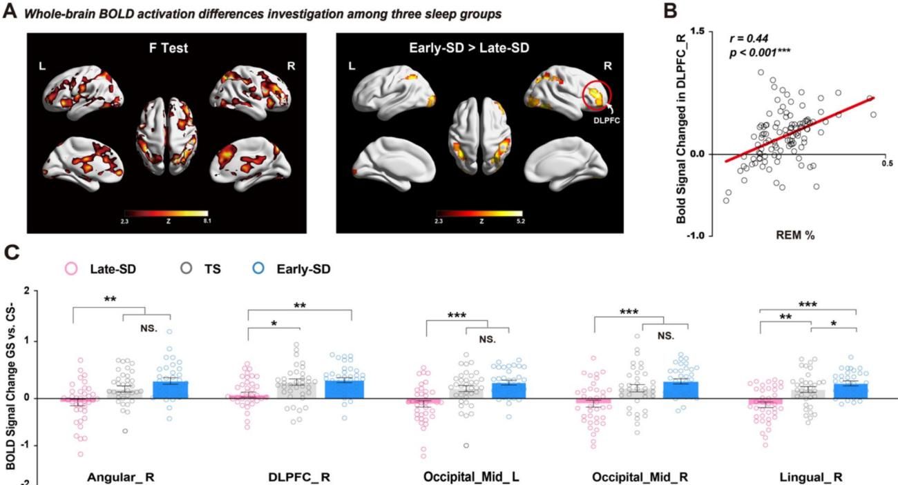 结果发现,那些拥有充足REM睡眠的受试者(TS组和Early-SD组),在面对泛化刺激(GS)时,大脑中一个关键区域被显著激活了——这就是背外侧前额叶皮层(DLPFC)。