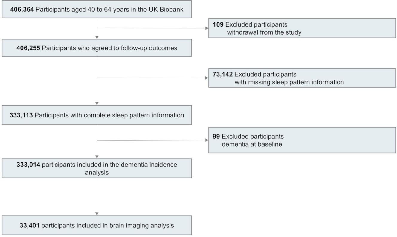 为了确保数据的严谨性,研究团队从50万人的庞大数据库中进行了严格筛选。如图[1]所示,研究最初纳入了40-64岁的中年人群,在排除了基线已患痴呆、睡眠数据缺失及中途退出的参与者后,最终确定了333,014名符合条件的参与者进入痴呆发病率分析。此外,其中有33,401名参与者还接受了脑部磁共振成像(MRI)扫描,这为后续探究睡眠如何影响大脑结构提供了宝贵的影像学证据。