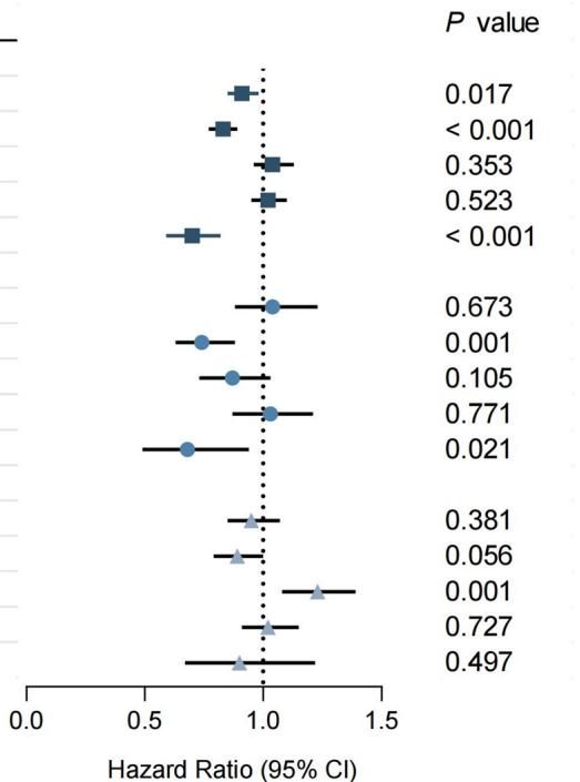 结果显示,健康睡眠模式的保护作用在较年轻的中年组(40-55岁)中更为显著。如图[3]所示,在40-55岁人群中,健康睡眠评分与痴呆风险降低的关联性极强(HR=0.85),而在56-64岁人群中这种关联虽然存在但相对较弱。交互作用检验(P for interaction < 0.001)证实了这种年龄差异具有统计学意义。