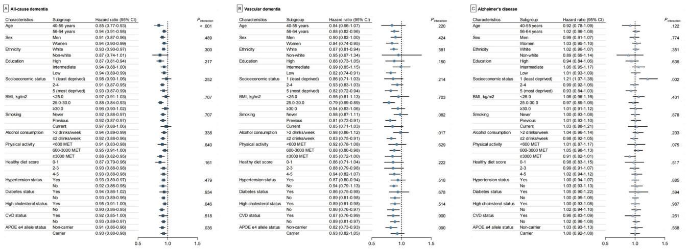 很多人认为防痴呆是老了以后的事,但这项研究给出了截然不同的结论。研究人员按年龄对人群进行了分层分析(40-55岁组 vs 56-64岁组)。