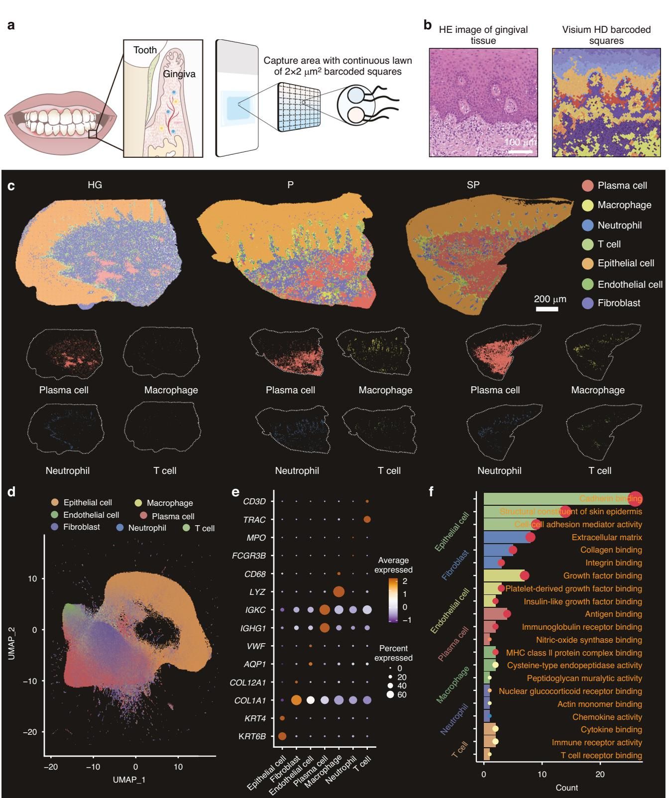 传统的检测手段往往把组织磨碎了测,就像把一杯果汁打匀了,你知道里面有苹果和香蕉,但不知道它们原本在哪儿。而这项研究使用的 Visium HD 技术,不仅能识别出牙龈里有哪些细胞,还能精准定位它们在哪儿、挨着谁、正在“跟谁说悄悄话”。