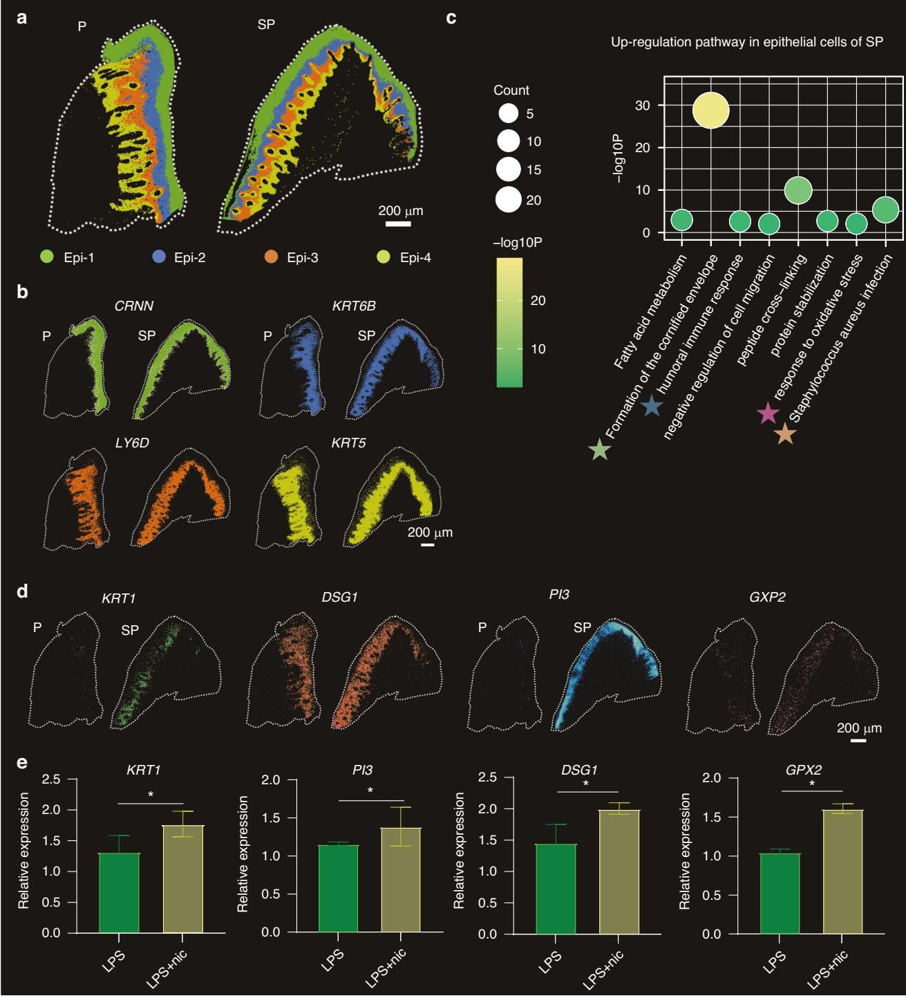 从图[2]中我们可以看到,与普通牙周炎患者(P组)相比,吸烟相关牙周炎患者(SP组)的上皮细胞中,一些关键的结构蛋白(如 KRT1, DSG1)表达发生了显著改变。这些蛋白原本是维持细胞间连接的“水泥”,现在水泥质量变差了,细胞间的连接变得松散,导致牙龈的防御屏障功能大打折扣。这就好比城墙的砖块之间没了灰浆,细菌和毒素可以长驱直入,直捣黄龙。