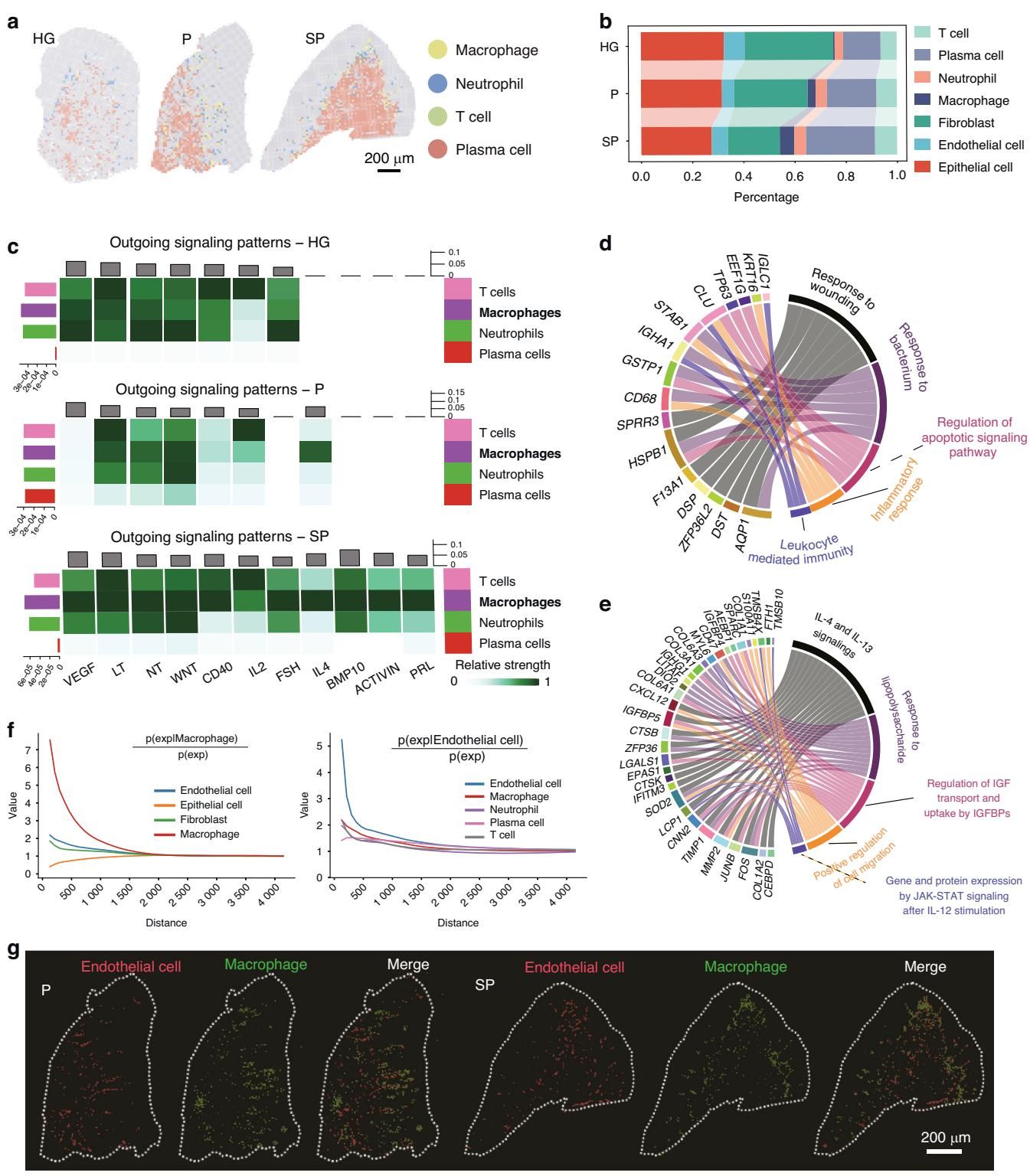 研究人员在“高清地图”上发现了一个惊人的现象:巨噬细胞(一种免疫细胞)总是喜欢扎堆在血管周围。如图[3]所示,特别是在吸烟相关牙周炎的组织中,空间分析显示巨噬细胞与血管内皮细胞的距离显著缩短,仿佛在进行一场亲密的“私密对话”。