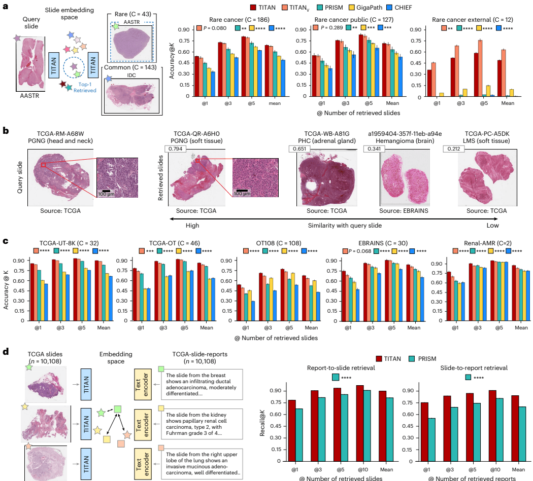 为了测试这一能力,研究团队构建了一个极具挑战性的“罕见癌症检索”任务。他们混合了常见的癌症类型和发病率极低的罕见癌症(如副神经节瘤、肾上腺皮质癌等),构建了一个庞大的数据库。如图[4]a所示,TITAN 在检索准确率(Accuracy@K)上大幅领先于其他所有模型。这意味着,当输入一张罕见的癌症切片时,TITAN 推荐的前几张相似切片中,包含正确诊断的概率最高。