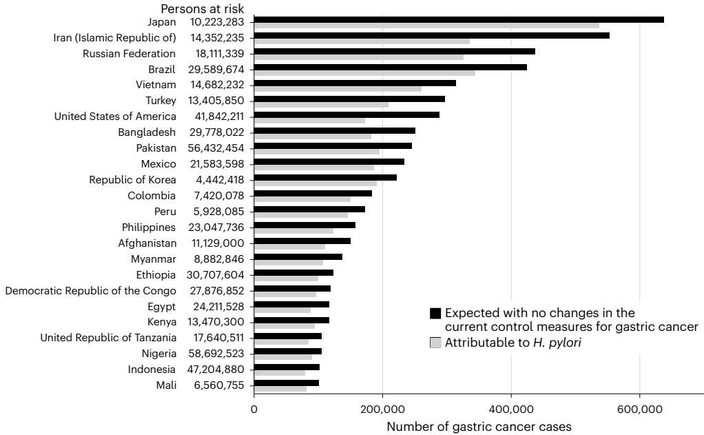 更值得注意的是图[2]中紧贴黑色长条下方的灰色长条,它代表了归因于幽门螺杆菌感染的病例数。从图中可以直观地看到,灰色长条与黑色长条的长度非常接近,这意味着绝大多数的预期胃癌病例,其罪魁祸首都可以追溯到这种细菌感染。