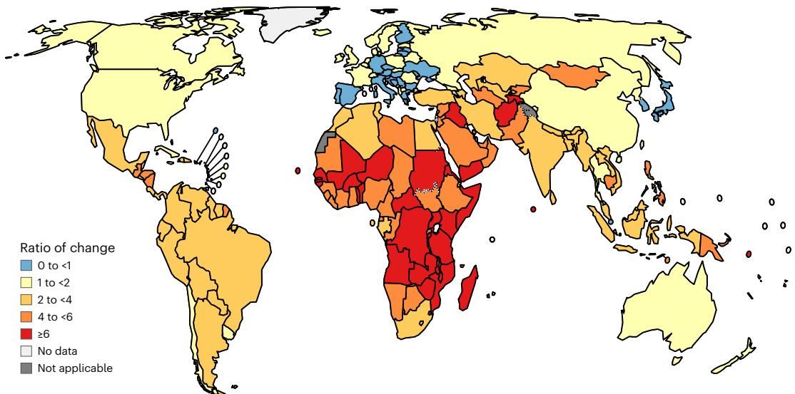 如图[4]所示,这张地图清晰地描绘了未来负担的增长趋势。图中颜色越红的区域,代表未来预期的胃癌病例数相对于现在的增长倍数越高。我们可以一眼看到,非洲大陆被大片的深红色覆盖,这意味着在这些地区,这代人未来的胃癌负担将是现在的4倍甚至6倍以上 [1]。相比之下,包括中国、美国在内的黄色区域增长倍数相对温和,而蓝色区域(如日本、韩国部分地区)甚至可能因为人口萎缩而出现负增长。