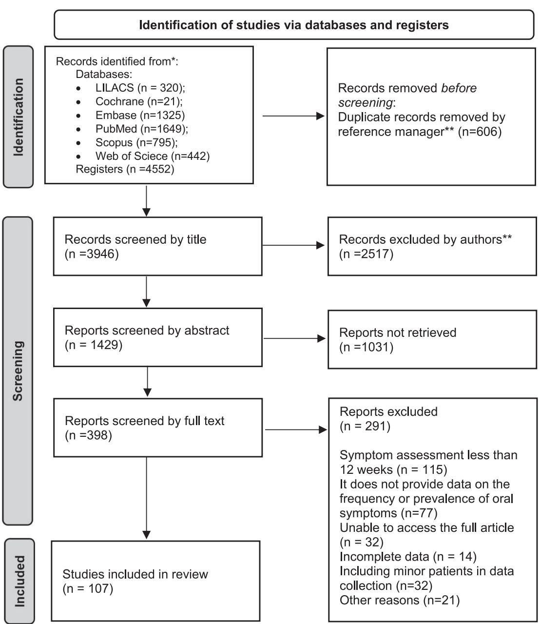 如图[1]所示,研究团队经过严苛的筛选流程,最终锁定了107项高质量的观察性研究进行深入分析。这不仅仅是一个简单的数字游戏,而是通过汇集全球数万名患者的数据,试图为我们拼凑出“长新冠”在口腔健康方面的真实全貌。