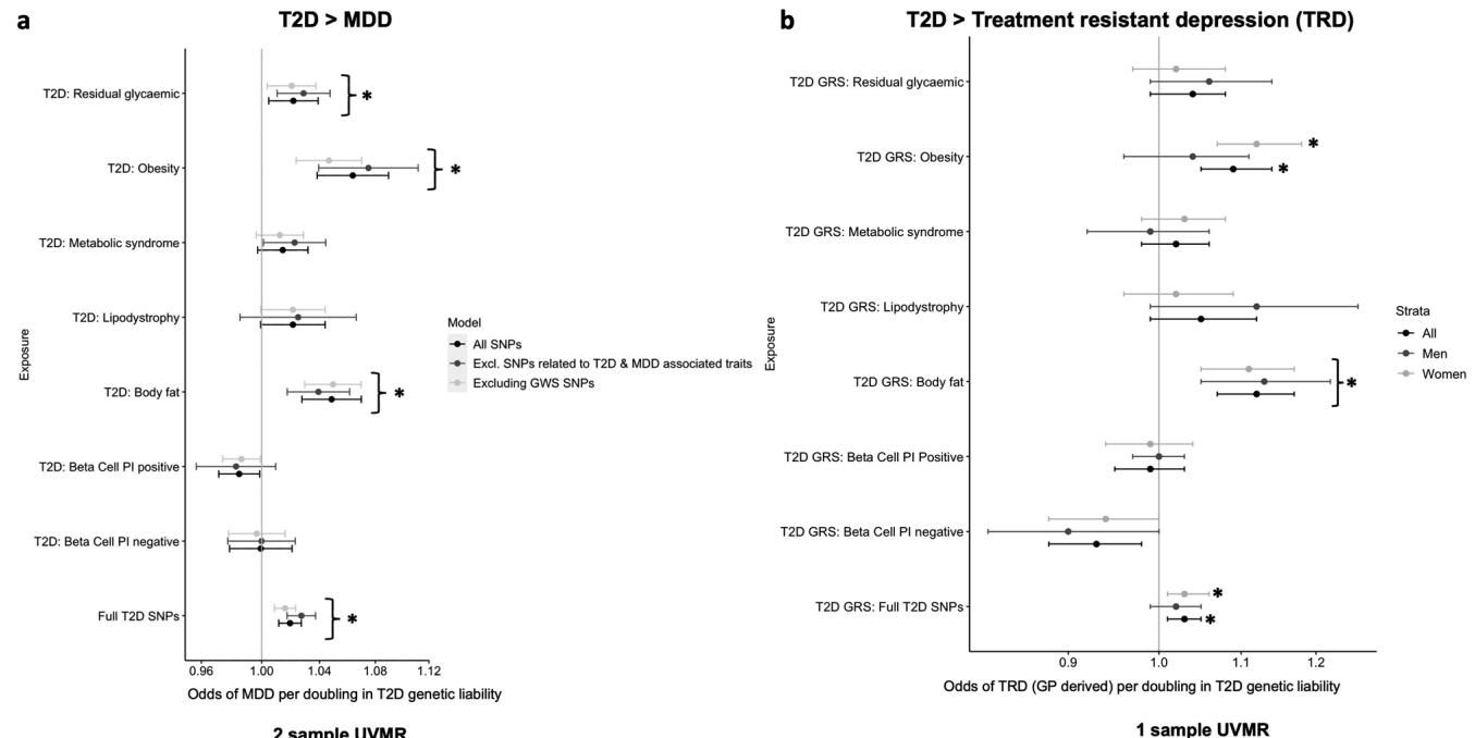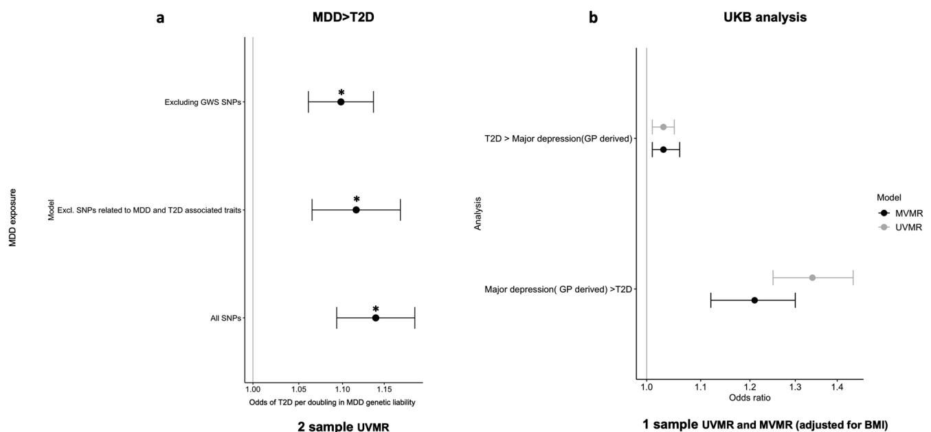 如图[1]所示,研究人员通过双样本和单样本孟德尔随机化分析,清晰地展示了这种双向关系。从图[1]中我们可以看到,在不同的分析模型中(包括排除多效性变异的敏感性分析),“MDD导致T2D”(图左侧a部分)的效应值(Odds Ratio)始终显著高于1,且置信区间紧凑,显示出极强的因果关联。而在图[1]右侧的b部分,利用UK Biobank数据进行的分析进一步证实,即使在校正了体重指数(BMI)后,抑郁症依然是糖尿病的独立预测因素,这暗示了除肥胖之外,还有更深层的神经内分泌机制在起作用。