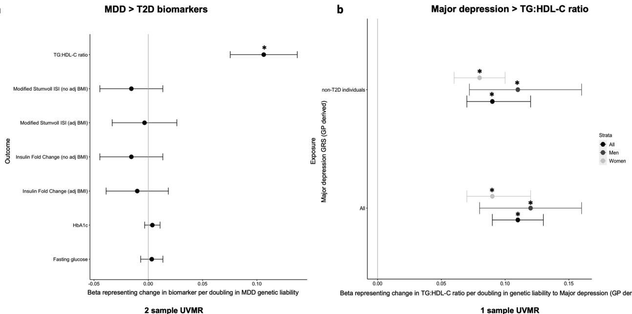 如图[3]所示,数据揭示了一个惊人的现象。在图[3]a的左侧部分,我们可以看到抑郁症的遗传风险对各类糖尿病生物标志物的影响。在众多指标中,位于最上方的TG:HDL-C比值呈现出极其显著的正相关(置信区间完全在0线右侧),而空腹血糖和糖化血红蛋白等传统指标在这一阶段的关联尚不明显。