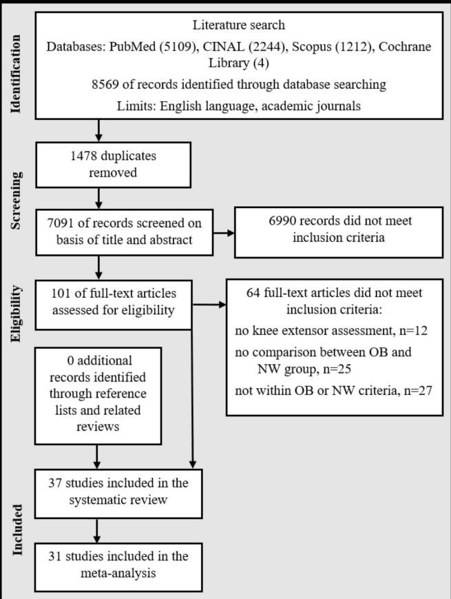 如图[1]所示,研究团队最初从PubMed、Scopus等权威数据库中检索到了多达8569条相关记录。经过严格的去重、标题摘要初筛,以及针对是否包含膝伸肌评估、是否有正常体重对照组等标准的全文审查,最终只有37项高质量研究(涵盖31项荟萃分析数据)成功入选。这张流程图清晰地展示了研究者如何像淘金一样,剥离掉数千份不符合标准的文献,最终提炼出关于肥胖与肌肉功能关系的最纯粹证据。